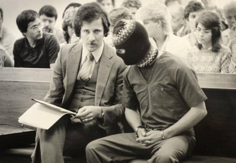 John Peel (right), pictured with an attorney, wore a ski mask to court in order to conceal his features.
