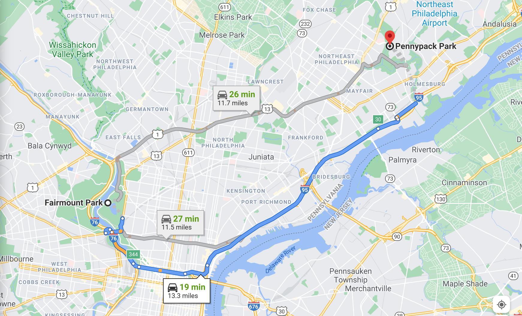 This map illustrates the distance between Fairmount Park (the location of the Fairmount Park Rapist’s first 3 known attacks) and Pennypack Park (the location of his 4th and last known attack). The distance between the two parks (approx. 12 miles) is significant, considering that the F.P.R. traveled by foot or bicycle and likely preferred to target victims close to his home. Courtesy of Google Maps.