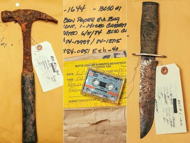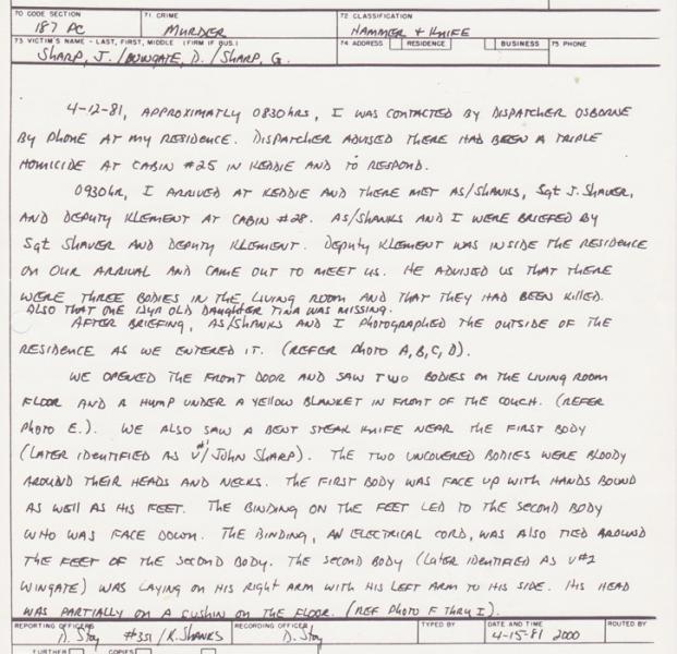 Pictured clockwise from top left: homicide victims Sue Sharp (age 36), John Sharp (age 15), Dana Wingate (age 17) and Tina Sharp (age 12). Family photos.Pictured: Cabin #28 at the Keddie Resort. Sue Sharp lived in the cabin with her 5 children. The murders occurred in its living room. Photo from the Plumas County Sheriff’s Office.Sue Sharp was a loving mother of 5. Here, she’s pictured with her children, 2 of whom were murdered along with her in April of 1981. Family photo.Pictured: Cabin #28, from an alternate viewpoint. Photo from the Plumas County Sheriff’s Office.This crime scene photo shows some of the blood stains on the carpet where 3 of the murders occurred. Photo from the Plumas County Sheriff’s Office.Two investigators examine a bloodstain on the wallpaper in the room where 3 of the murders occurred. Photo from the Plumas County Sheriff’s Office.Pictured: Page 1 of the original hand-written police report. Photo from the Plumas County Sheriff’s Office.Pictured: evidence items including a hammer and knife (murder weapons) and a tape cassette containing a call recording. Photo from the Plumas County Sheriff’s Office.Pictured: Martin Smartt. He was a neighbor of the Sharp’s at the time of the murders, and is considered a suspect.
