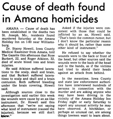 Rose Burkert was 22-years-old when she was murdered in September of 1980. She was the mother of a 2-year-old daughter, and a nursing student. Image source: family photo.Roger Atkinson was 32-years-old when he was murdered in September of 1980. He was a father, husband and professional telephone line installer / repairman. Image source: family photo.Pictured: the Iowa motel room in which Rose and Roger’s lives were ended by (an) ax-wielding assailant(s). Image source: police photo.This diagram of the crime scene illustrates the positions that Rose and Roger’s bodies were found in, as well as other details noted by investigators. Image source: Greg Good / Cedar Rapids Gazette.Charles Ray Hatcher was a serial killer to whom Roger Atkinson was related (through marriage). He has been considered as a person of interest in Roger and Rose’s case, but their murders do not align with Hatcher’s usual MO. Image source: police booking photo.An unusual clue was found at the scene of Rose and Roger’s double-murder in the form of a tube of toothpaste that had been emptied into the bathtub. This unusual act possibly links the murders to another that had happened weeks before, in different hotel. Image source: police photo / Iowa County Sheriff’s Office.