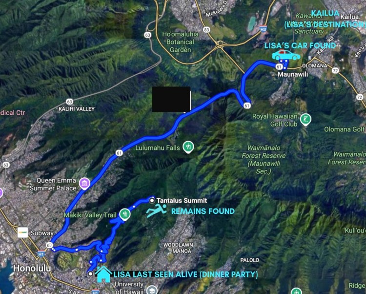 Pictured: Lisa’s car from which she is believed to possibly have been abducted. It was found abandoned along a highway near her home. Image source: KGMB.Pictured: Lisa’s parents, who searched diligently for her after her disappearance, and were heartbroken to learn that she had been murdered. Here, they’re seen talking to news media. Both died without seeing their daughter’s murder solved. Image source: KGMB.After Lisa vanished, enormous search efforts were launched, and her family + volunteers left countless fliers on vehicles. Despite their efforts, Lisa wasn’t found until 10 days later, when her remains were located by a man walking his dog. Image source: Hawaii news now.This map depicts where Lisa was last seen alive, where her car was found abandoned, where her remains were found, and her destination. Image source: Google Maps.Lisa Au was 19-years-old when she vanished from the Hawaiian island of Oahu during a stormy night in January of 1982. Her car was found abandoned not far from her home, and her remains were found 10 days later at Tantalus Summit. Her murder remains unsolved. Image source: family photo.