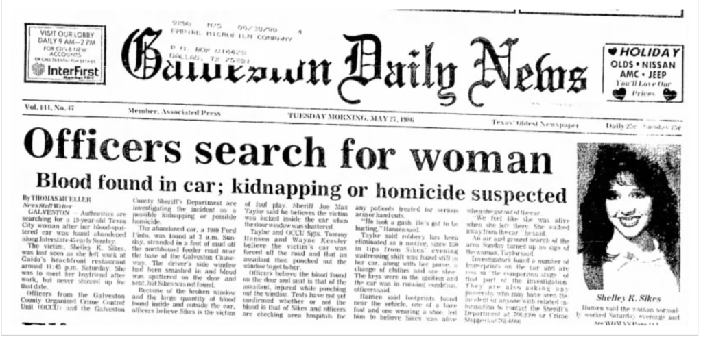 Shelley Sikes was 19-years-old when she was abducted from her vehicle near Galveston, Texas in 1986.. Image source: family photo.Shelley had a passion for dance, and dreamed of one day owning and running her own dance studio. Image source: family photo.Shelley’s drive from her place of work on Galveston Island to her hometown of Texas City was only 15 minutes long. During that drive, she was forced off the road and dragged from her car. Image source: Google Maps.The Galveston Daily News covered Shelley’s story from the start. Image source: Galveston Daily News.