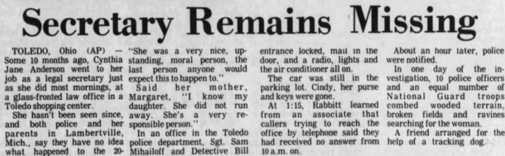 Cynthia Anderson was 20-years-old when she disappeared from her place of work in Toledo, Ohio in August of 1981. She has not been seen since. Image source: family photo.Cynthia went inexplicably missing from the law office where she worked on Toledo’s north side.