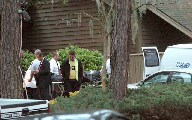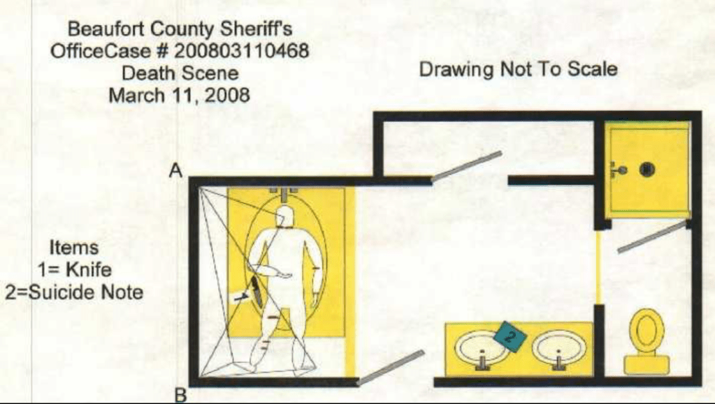 The Beaufort County Sheriff’s Office produced this sketch of the scene where Gerwing’s body was found after his self-inflicted death. He left behind a knife and a suicide note. Image source: Beaufort County Sheriff’s Office.The Calvert’s split their time between their Atlanta, GA home and their Yacht, The Yellow Jacket, which they docked on Hilton Head Island. Here, investigators examine the yacht after their double-disappearance. Elizabeth and John’s whereabouts remain unknown, although they have been declared dead. Dennis Gerwing–an accountant who the Calverts suspected of embezzling from them–took his own life shortly after their disappearance. In this photo, officials remove his body from his home. Image source: The State.Dennis Gerwing (left) was a CPA and CFO of The Club Group, a management company that the Calverts had hired to manage their business’ financial affairs. They went missing after a meeting where they’d planned to confront him over embezzlement. Image source: family photo.When investigators spoke to Gerwing immediately after the Calvert’s disappearance, they noticed a suspicious cut to his hand. The cut resembled “slide bite” from a firearm. Image source: Beaufort County Sheriff’s Office.John and Elizabeth Calvert were 47 and 45-years-old, respectively, when they vanished from Hilton Head Island. Image source: family photo.