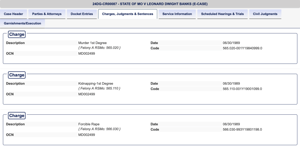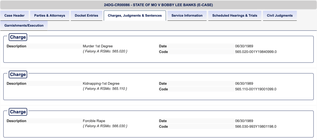Kelle Ann Workman was 24-years-old when she was abducted from rural Dogwood, Missouri and brutally murdered in 1989. She was a hard-working young woman, beloved by her family. Image source: family photo.Kelle’s family published this in memory of her on the 7th anniversary of her death. Image source: the Springfield News Leader via Newspapers.com.Kelle was working one of her jobs, mowing a cemetery, when she was abducted by her killers. Image source: the Springfield News Leader via Newspapers.com.Bobby Banks was charged with Kelle’s 1989 abduction, sexual assault and murder in February of 2024. Image source: Douglass County Sheriff’s Department.Leonard “Dwight” Banks was charged with Kelle’s 1989 abduction, sexual assault and murder in February of 2024. Image source: Douglass County Sheriff’s Department.Wiley Belt was charged with Kelle’s 1989 abduction, sexual assault and murder in February of 2024. Image source: Douglass County Sheriff’s Department.The charges filed against Bobby Banks in relation to Kelle’s murder. Image source: Missouri Courts.The charges filed against Leonard “Dwight” Banks in relation to Kelle’s murder. Image source: Missouri Courts.The charges filed against Wiley Belt in relation to Kelle’s murder. Image source: Missouri Courts.Kelle’s parents (pictured) were haunted for decades by her unsolved abduction and murder. Her father, Stanley Workman (bottom right) died without ever seeing justice served. Her mother, Joan Workman (bottom left) survives, along with other beloved family members. Image source: the Springfield News Leader via Newspapers.com.